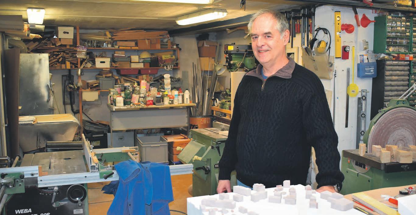 Hier riecht es nach Leim und Holz. Kaspar Steger in seiner kreativen Werkstatt mit einem Wettbewerbsgrundlagen-Modell. (Bild Marianne Voss)
