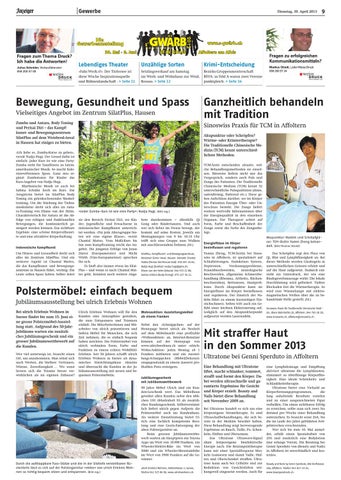 bote dazukommen – allenfalls Qi Gong oder Kindertanzen. Und auch wer sich lieber im Freien bewegt, der kommt auf seine Kosten: Jeweils am Montagmorgen von 9 bis 10.15 Uhr trifft sich eine Gruppe zum Walken mit anschliessendem Dehnen. (tst.) SilatPlus, Kampfkunst- und Bewegungszentrum, Weisbrod-Zürrer-Areal, Hausen. Kontakt: Chantal Mattes (Perisai Diri/Pencak Silat): 078 697 26 64; Nadja Hugi (Zumba): nadja.hugi@gmx.ch; Eliane van der Helm (Antara): 044 553 22 88; Sabina Schülin (Body Toning): 079 227 56 22.