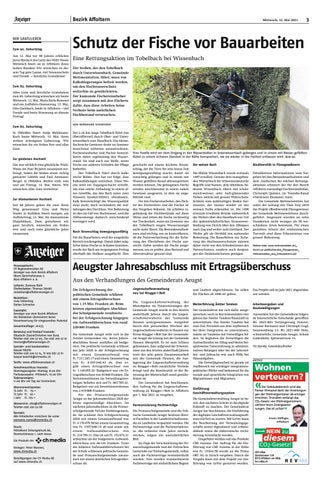 Herausgeberin: CH Regionalmedien AG Anzeiger aus dem Bezirk Affoltern Obere Bahnhofstrasse 5 8910 Affoltern a. A. Leiterin: Barbara Roth Chefredaktor: Thomas Stöckli redaktion@affolteranzeiger.ch Redaktion: Livia Häberling Stefan Schneiter Copyright: Anzeiger aus dem Bezirk Affoltern Die Redaktion übernimmt keine Verantwortung für eingesandtes Material Gesamtauflage: 26 633 Beratung und Verkauf Inserate: Elisabeth Zipsin/Christine von Burg Telefon 058 200 57 00, Fax 058 200 57 01 inserat@affolteranzeiger.ch Spezial- und Sonderseiten: Kaspar Köchli Telefon 058 200 57 14, M 079 682 37 61 kaspar.koechli@chmedia.ch Tarife: www.affolteranzeiger.ch Annahmeschluss Inserate: Dienstagausgabe: Montag, 8.00 Uhr Freitagausgabe: Mittwoch, 16.00 Uhr Todesanzeigen: 11.00 Uhr am Tag vor Erscheinen Abonnementspreise: ¼ Jahr Fr. 79.– ½ Jahr Fr. 97.– 1 Jahr Fr. 170.– Aboservice: abo@affolteranzeiger.ch Telefon 058 200 55 86 Kontakt: Alle Mitarbeiter erreichen Sie unter vorname.name@chmedia.ch Druck: Mittelland Zeitungsdruck AG, Neumattstrasse 1, 5001 Aarau Ein Produkt der Verleger: Peter Wanner, www.chmedia.ch Beteiligungen der CH Media AG auf www.chmedia.ch