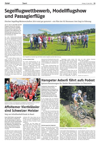 Das erste Wettbewerbswochenende der Zürcher Segelflug-Meisterschaften 2014 ist als durchmischt zu betrachten. Am ersten Wettbewerbstag war die Wetterlage für die 19 Wettbewerbspiloten gut. Der Start der Segelflieger erfolgte um 13 Uhr und dauerte mit 4 Schleppmaschinen bis 14.37 Uhr an. Die Segelflugpiloten wurden an den Rossberg geschleppt, wo Sie bis zur Freigabe der Startlinie um 14.57 Uhr ausharrten. Die Piloten hatten am ersten Tag eine Aufgabe zu erledigen, welche über die Wendepunkte Bieler Höhe, Oberalp und Horben führte und zusammen eine Strecke von 301 km bildete.