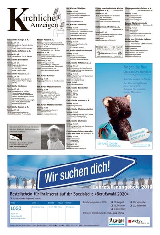 Kath. Kirche Affoltern a. A. Samstag, 20. Juli 14.30 Gottesdienst im Haus Senevita 17.30 Eucharistiefeier mit Gastpriester Alfons Brunner Sonntag, 21. Juli 9.00 Eucharistiefeier mit Gastpriester Alfons Brunner 19.00 Keine Santa Messa Freitag, 26. Juli 9.15 Kein Gottesdienst