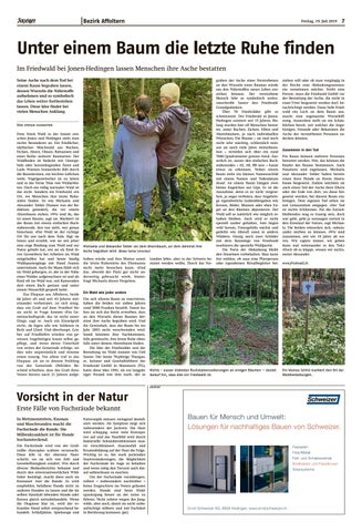 graben der Asche eines Verstorbenen an den Wurzeln eines Baumes würde aus den Nährstoffen neues Leben entstehen können. Der verstorbene Mensch lebe so symbolisch weiter, umschreibt Sauter den FriedwaldGrundgedanken. Über 70 Friedwälder gibt es schweizweit. Der Friedwald in JonenHedingen existiert seit 15 Jahren. Bislang wurden hier elf Menschen bestattet, unter Buchen, Eichen, Eiben und Ahornbäumen, je nach individuellen Wünschen. Die Bäume – sie sind noch nicht sehr mächtig, schliesslich müssen sie noch viele Jahre weiterbestehen – verteilen sich über ein rund 7000 Quadratmeter grosses Areal. Äusserlich ist, ausser den einfachen Buchstabencodes – AE, AK, BB usw. – kaum etwas zu erkennen. Neben einem Baum steht ein kleines Namensschild mit einem Namen und Todesdatum drauf. An einem Baum hängen zwei kleine Engelchen aus Gips. Es ist die Ausnahme, denn es ist nicht vorgesehen, ja sogar verboten, dass Angehörige irgendwelche Gedenkbeigaben wie Kerzen, Bilder, Blumen oder eben Engel an den Bäumen deponieren. Der Wald soll so natürlich wie möglich erhalten bleiben. Auch wird er nicht speziell sauber gehalten, Äste liegen wild herum, Untergehölz wächst und gedeiht wie überall sonst in andern Wäldern. Einzig noch zwei Schilder mit dem Baumlogo von Friedwald markieren die spezielle Waldpartie. Die Form der Abdankung bleibt den Einzelnen vorbehalten. Man kann frei wählen, ob man eine Pfarrperson oder irgendeinen Ritualbegleiter bei-