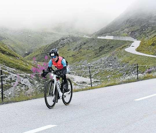 5000 Höhenmeter mit dem Rad Die Radstrecke ist denn auch keine Feierabendrunde für jedermann, sondern mit 195 Kilometern und knapp 5000 Höhenmeter von Livigno über Forcola die Livigno Bernina-, Ofen-, Stelvio- und Foscagnopass zurück nach Livigno ein echter Brocken. Mit noch fast vollen Energiespeichern und im Gegensatz zu vielen Trainings zuvor, mit ausgeruhten Beinen, liessen sich die ersten beiden Pässe aber locker bewältigen und am Ofenpass gar die grosse Masse abschütteln, was für den weiteren Verlauf des Rennens durchaus von Vorteil war. Der Umstand, dass jeder Athlet für die gesamte Fahrradstrecke ein Begleitfahrzeug haben musste, hat zusammen mit dem üblichen Touristenverkehr zu einem grösseren Verkehrschaos geführt. So musste ich die ersten Kilometer auf den Stelviopass noch viel zu warm bekleidet und ohne Energienachschub in Angriff nehmen, bevor mein Supportfahrzeug zur Stelle war Apropos Energie. Die angegebene Höchsttagesmenge an Energiedrinks habe ich um ein Vielfaches überschritten und der Jahresbedarf an Brötchen mit Schokoladenriegel kann ebenfalls als erledigt angesehen werden. Kein sehr modernes Ernährungskonzept, aber immerhin blieb ich bis auf ein leichtes Schwächeln kurz vor Erreichen des Stelviopasses vor einem grossen Leistungseinbruch verschont. Als ich nach bald neun Stunden vom Sattel steigen durfte, war ich dennoch sehr erleichtert. Es dauerte einen Mo-