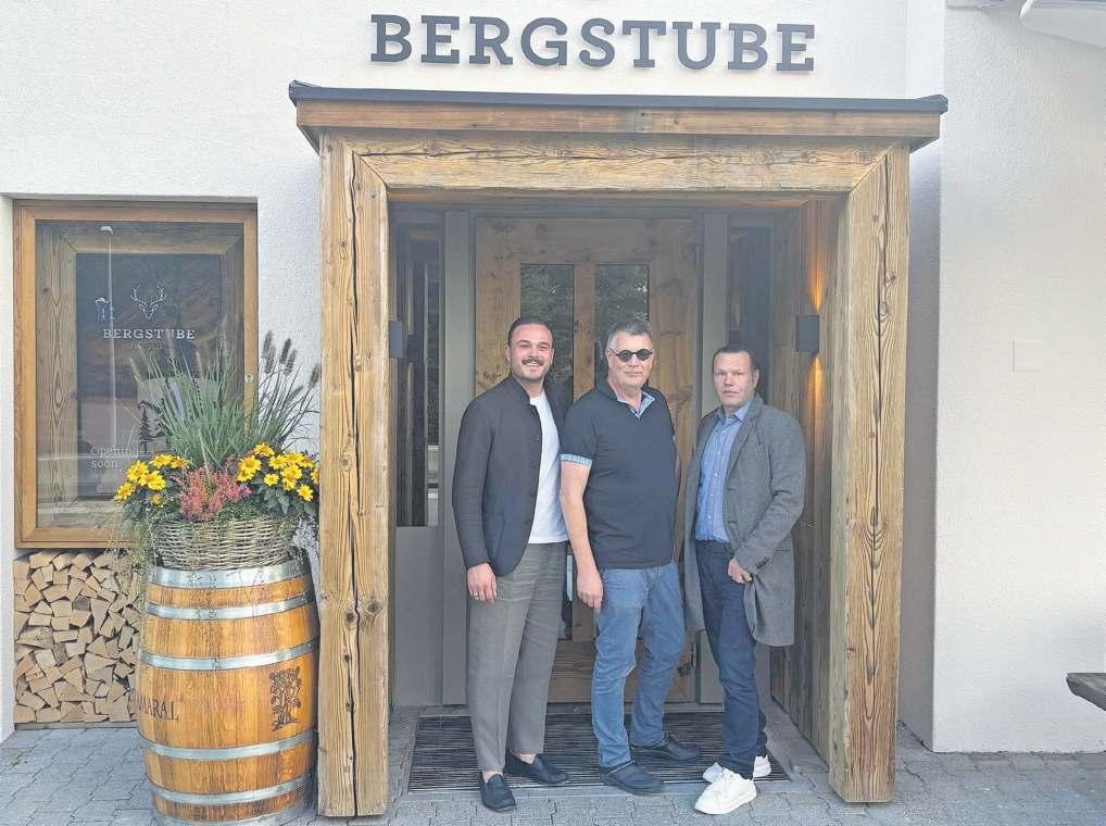 Fabian Fry, Direktor der Hotel Uto Kulm AG, mit Wirt Dirk Luttmann und dem Strategieverantwortlichen Benjamin Styger vor dem neuen Restaurant Bergstube. (Bild Amélie Schneider)