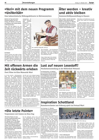 management. Als zuletzt selbstständiger Unternehmensberater kommt er zur Einsicht, dass der Übergang von einer bankinternen Projektsitzung zum Kabarett fliessend ist. 2004 tritt Thomas Lötscher mit der Figur «Veri» erstmals auf. Ausgespielt sind seine Programme «Ab- und Zufälle» (2008-2012) und «Typisch Verien!» (2013-2016). Seit 2007 spielt er jährlich den kabarettistischen «RückBlick». Seit 2009 Veri, «politisch.witzig.träf». (Bild zvg.) spielt Thomas Lötscher auch im deutschsprachigen dem Urnengang … eine brandaktuelle Ausland, vornehmlich in Deutschland. Pointe nach der anderen aufzutischen, Aktuell ist er dort mit einer länderspe- authentisch, frech und schlagfertig zifischen Version von «Typisch Ver- über Politiker und Politik zu lästern, ien!» unterwegs, ab Herbst 2018 mit ist ein Phänomen.» (pd.) einem neuen Programm. «Feinstes Sozialkabarett» titelte die Süddeutsche Freitag, 20. Oktober. Beginn 20 Uhr, Abendkasse Zeitung. Romano Cuonz in der Ob- und Türöffnung 19 Uhr. Tickets gibts auf der Post waldner Zeitung schrieb: «Dass ein Ka- oder online www.ticketino.ch. Weitere Infos: barettist imstande ist, ab Montag nach www.veri.ch.