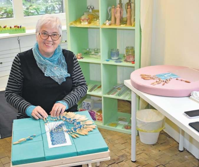 Ruth Terraz in ihrer Ecke des Gemeinschaftsateliers. Auf dem Klöppelbrett entsteht eine zarte Spitze für Pulswärmer. (Bild Marianne Voss)
