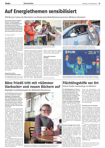 Bänz Friedli tritt mit «Gömmer Flüchtlingshilfe vor Ort Starbucks» und neuen Büchern auf Verein Ceriba: Sammeltage in Affoltern Highlight im Jubiläumsjahr der Bibliothek Bonstetten Die Bibliothek Bonstetten bietet am 13. November ein weiteres Highlight im Jubiläumsjahr. Bänz Friedli präsentiert Szenen aus seinem Programm «Gömmer Starbucks» und liest aus seinen neuen Büchern «Und er fährt nie weg» und «Es gibt Tage, da sind alle Menschen blau und sprechen Chinesisch». Der Kabarettist, Autor und Hausmann wurde durch die «Pendlerregeln» in «20 Minuten» bekannt. Seine wöchentlichen Hausmann-Kolumnen im «Migros Magazin» erreichten Kultstatus. Ebenso ist er am Radio SRF1 in der «Zytlupe» Gast. Er ist bekannt für seine Wortspiele, seinen Sprachwitz, seine Parodien und tritt in der Deutschschweiz mit kabarettistischem Programm auf. Ab 2007 trug er seine «Hausmann»-Kolumnen öffentlich vor, wobei die Lesungen, gespickt mit Improvisation und «Zytlupe»-Texte, sich zunehmend zu satirischen Auftritten entwickelten. Daraus entstand das kabarettistische Programm «Sy no Frage?», das Friedli zwischen 2011 und 2014 rund 250-mal zeigte. 2013 startete er mit «Gömmer Starbucks» als Comedian und wird am 9. Mai 2015 mit der Theaterauszeichnung «Salzburger Stier» geehrt. Die Bibliothek freut sich, den gefragten Gast am 13. November in der Aula des Oberstufenschulhauses, um 20 Uhr, zu begrüssen. Es sind noch wenige Tickets an der Abendkasse ab 19.30 Uhr erhältlich. Der Ticketpreis beträgt 20 Franken. (sa)
