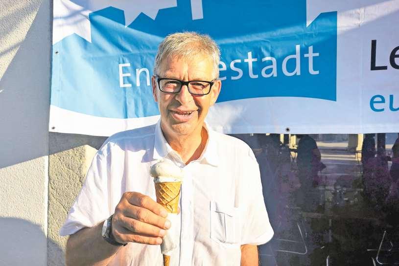 Schnell schlecken, bevor sie schmilzt: Stadtammann Daniel Mosimann isst am «3-2-1-heiss»-Anlass eine feine Glace Foto: Fr tz Thut