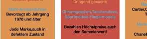 Dringend gesucht! Rolex & Heuer Uhren auch defekt! FÜR FOLGENDE WERTGEGENSTÄNDE BIETEN WIR EINEN BARANKAUF AN Diamantschmuck, Brillanten, Zahngold, Bruchgold, Platin, Gold- und Silberbarren Münzen Silber- und Tafelbesteck Versilbertes Zinn. Taschen- und Grossuhren hochwertige Armbanduhren (auch beschädigt), ...Wir nehmen gerne Uhren der Marken: Rolex, IWC, Breitling Omega Patek Philippe Audemars Piguet, Hublot, Panerai, Jaeger-LeCoultre und andere