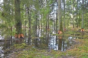 Besonders gut sichtbar ist momentan, dass der Biber die grossen Weisstannen geschält hat «Sie werden in etwa zwei Jahren absterben», weiss Adrian Wullschleger Damit schafft der Biber Licht und Platz für andere Baumarten wie Weiden und Erlen die von Natur aus an vernässten Stellen wachsen Undgleichzeitig«Biberfutter»sind Auch die absterbenden Tannen erfüllen ihren Zweck im Kreislauf der Natur Sie werden zu Totholz Totholz wiederum ist Lebensgrundlage tausender Arten von Tieren, Pflanzen, Pilzen, Moosen und Flechten und begünstigt zum Beispiel Käfer Käfer wiederum begünstigen Spechte Auf einen kurzen Nenner gebracht: Baumeister Biber fördert die Biodiversität nachhaltig Und sorgt trotzdem für ein gewisses Konfliktpotenzial THOMAS FÜRST