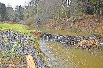 Adrian Wullschleger Der Nager hat einen Damm errichtet – das Wasser ist auch schon übers Bachbett hinausgeschwappt Weil sich Häuser in der Nähe befinden gilt es die Entwicklung ge-