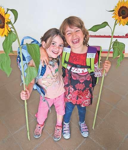 Mit Blumen empfangen: Die zwei Erstklässlerinnen freuen sich über den Start in einen neuen Lebensabschnitt BILD: RAN