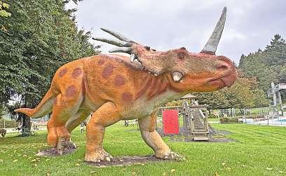 Das Aussengelände der Badi Entfelden hat sich in ein Stück Erdgeschichte verwandelt: Die Ausstellung «The World of Dinosaurs» bringt über 50 lebensgrosse DinosaurierModelle nach Unterentfelden – vom scharfzahnigen Tyrannosaurus rex über den friedlichen Triceratops bis hin zum gepanzerten Stegosaurus Die täuschend echten Urzeit-Gigan-