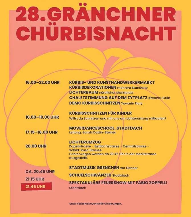 16 Uhr: 28. Gränchner Chürbisnacht. Chürbisnacht in Grenchen mit Markt, Lichterumzug, kulturellem Rahmenprogramm und herbstlicher Stimmung. Stadttradition und Publikumsmagnet. Marktplatz