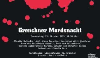 19.30 Uhr: Grenchner Mordsnacht. Lesungen von Claudia Dahinden, Barbara Saladin und Christof Gasser aus Krimis, moderiert von Claudia Merz. Eintritt frei, Kollekte. www.parktheater-grenchen.ch Parktheater, Lindenstrasse