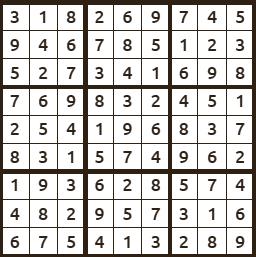 Alle Zahlen von 1 bis 9 sind in jeder waagrechten Zeile und in jeder senkrechten Spalte je einmal unterzubringen. Auch jedes kleine 3 × 3-KästchenQuadrat darf nur je einmal die Zahlen 1 bis 9 enthalten.