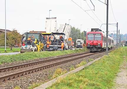 Während am Samstag die Strasse planmässig abgefräst und eine Emulsion aufgetragen wurde, gab es am Sonntagmorgen zuerst eine böse Überraschung Diebe haben in der Nacht elektronische Bedienkonsolen entwendet die für die präzise Nivellierung der Strasse unentbehrlich sind Es sei dies nicht der erste Einbruch gewesen, erfährt der «Landanzeiger» von Suhrs Brunnenmeister Timo Schlatter – dazu später mehr Schlatter nahm am Sonntag ebenfalls einen Augenschein vor Ort und tauschte sich mit den ausführenden Kräften aus Auch er war an den Arbeiten unter dem Boden beteiligt: «Die Technischen Betriebe Suhr haben eine 109 Jahre alte Wasserleitung ersetzt, die einerseits bis zu einem Hof im Norden geht und aber auch unter der SBB-Strecke durchführt Hier wird mit äusserster Genauigkeit gearbeitet wie durch gelbe Markierungen an den Schienen zu erkennen ist «Wir wissen zum Beispiel dass sich die Schiene um 1 Millimeter gesenkt hat, das liegt aber im Toleranzwert» Eine so lange Leitung habe er in 18 Jahren im Amt noch nie betreut, so der Brunnenmeister Etwa 700 oder 800 Meter solcher Leitungen würden in Suhr üblicherweise pro Jahr gebaut