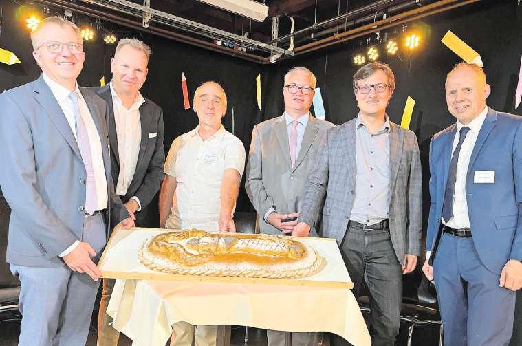 Schlüsselmoment: (v l ) Felix Heiri (Präsident des Trägervereins Bachtelen), Marco Feusi (CEO Hiag), Alex Brunner (TaDo-Leiter), Remo Ankli (Regierungsrat), Daniel Urech (Gemeindepräsident), Gustav Keune (Gesamtleiter der Institution Bachtelen) FOTO BEA ASPER