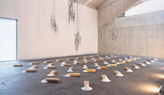 40 Holzkuben reihen sich am Boden, auf jedem ein Häufchen Prattler Salz wie ein Ausrufezeichen. Darüber hängen Weidenzweige aus den Meriangärten, in Paraffin getaucht, weiss überzogen wie aus einem Gradierwerk. An der Wand Fotos von Berg- und Salzwerken aus aller Welt. Eines zeigt einen Krater voll blutrotem Wasser. «Da fällt man besser nicht hinein», kommentiert Lootz. Es ist der Corte Atalaya, ein Überrest der Kupferminen von Riotinto. Sein vergiftetes Grundwasser ist eine Wunde in der andalusischen Landschaft.