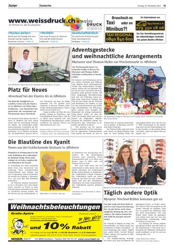 günstigsten Preise», so Walter weiter. Ein weiteres Plus von myoptix sei die grösste Auswahl im Säuliamt. Nach wie vor gewährt der Affoltemer Optiker einen Partner-Rabatt. Wer zwei Brillen kauft, erhält die günstigere zum halben Preis und wer eine alte Korrekturbrille zurückbringt, erhält 50 Franken an eine neue. Von Montag bis Freitag empfangen Michael Walter und sein Team an der Betpurstrasse 9. Und wenn am 4. Dezember der Affoltemer Weihnachtsmarkt stattfindet, ist die Tür auch am Sonntag offen. (tst.) myoptix, Betpurstrasse 9, Affoltern, Telefon 043 541 02 09, www.myoptix.ch.