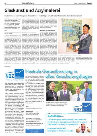 Gutschein … …für einen gratis Versicherungs-Check inklusive Feedback, was sich optimieren lässt mit Lösungen zum Sparen – es lohnt sich garantiert! Einzulösen bei der NBZ Marktplatz 5, Affoltern am Albis