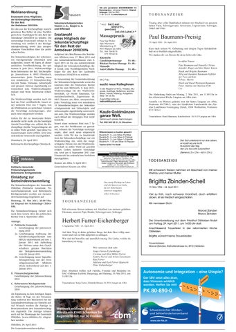 Am Mittwoch, 11. Mai 2011, 13.30 Uhr, findet im engsten Familienkreis auf dem Friedhof, anschliessend um 14.15 Uhr in der reformierten Kirche die Beisetzung/Abdankung für Rosmarie Gerber-Wenger statt.