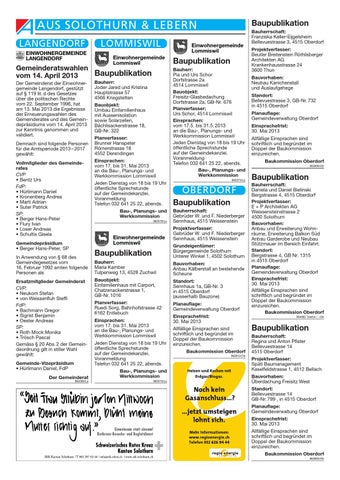 Baupublikation Bauherr: Pia und Urs Schor Dorfstrasse 2a 4514 Lommiswil Bauobjekt: Freisitz-Glasbedachung Dorfstrasse 2a, GB-Nr. 676 Planverfasser: Urs Schor, 4514 Lommiswil Einsprachen: vom 17.5. bis 31.5. 2013 an die Bau-, Planungs- und Werkkommission Lommiswil Jeden Dienstag von 18 bis 19 Uhr öffentliche Sprechstunde auf der Gemeindekanzlei. Voranmeldung Telefon 032 641 25 22, abends. Bau-, Planungs- und Werkkommission 865575/Lo