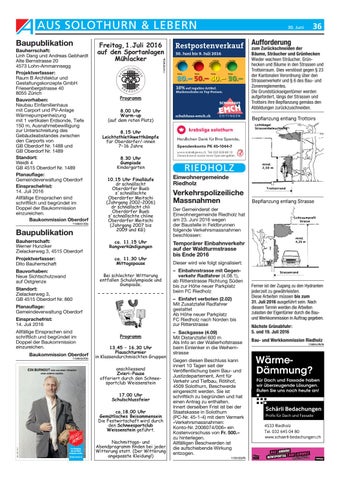 AUS SOLOTHURN & LEBERN Bauherrschaft: Linh Dang und Andreas Gebhardt Alte Bernstrasse 20 4573 Lohn-Ammannsegg Projektverfasser: Raum B Architektur und Gestaltungskonzepte GmbH Friesenbergstrasse 40 8055 Zürich Bauvorhaben: Neubau Einfamilienhaus mit Carport und PV-Anlage Wärmepumpenheizung mit 1 vertikalen Erdsonde, Tiefe 150 m, Ausnahmebewilligung zur Unterschreitung des Gebäudeabstandes zwischen den Carports von GB Oberdorf Nr. 1488 und GB Oberdorf Nr. 1489 Standort: Weidli 4 GB 4515 Oberdorf Nr. 1489 Planauflage: Gemeindeverwaltung Oberdorf Einsprachefrist: 14. Juli 2016 Allfällige Einsprachen sind schriftlich und begründet im Doppel der Baukommission einzureichen. Baukommission Oberdorf 1159251/Ob
