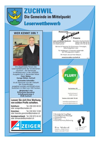 Die abgebildete Person des Leserwettbewerbs der Sonderseiten «Zuchwil – die Gemeinde im Mittelpunkt» in der AZEIGERAusgabe vom 3. November heisst Peter Weber, Garage Weber, Zuchwil Jeannette Schmidlin ist als Gewinner aus der Vielzahl der Einsendungen ausgelost worden und erhält einen Gutschein im Wert von 100 Franken gesponsert von Ristorante Boccalino Schulhausstrasse 2 4528 Zuchwil