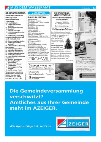 Weihnachtsbäume Der Weihnachtsbaumverkauf der Bürgergemeinde Zuchwil findet am Samstag, 22. Dezember 2012, von 8.00 bis 11.00 Uhr beim Werkhof der Einwohnergemeinde Zuchwil am Asylweg statt. Der Verkauf findet erst ab 8 Uhr statt! Es besteht weiter die Möglichkeit, Deckäste zu kaufen. Die Behörden der Bürgergemeinde Zuchwil wünschen der ganzen Einwohnerschaft frohe Festtage und alles Gute im neuen Jahr. 817746/1457/Zu