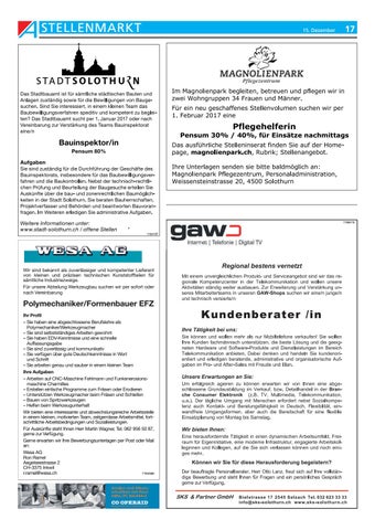 Polymechaniker/Formenbauer EFZ Ihr Profil – Sie haben eine abgeschlossene Berufslehre als Polymechaniker/Werkzeugmacher – Sie sind selbstständiges Arbeiten gewohnt – Sie haben EDV-Kenntnisse und eine schnelle Auffassungsgabe – Sie sind zuverlässig und kommunikativ – Sie verfügen über gute Deutschkenntnisse in Wort und Schrift – Sie arbeiten genau und sauber in einem kleinen Team Ihre Aufgaben – Arbeiten auf CNC-Maschine Fehlmann und Funkenerosionsmaschine Charmilles – Erstellen einfache Programme zum Fräsen oder Erodieren – Unterstützen Werkzeugmacher beim Fräsen und Schleifen – Bauen von Spritzwerkzeugen – Helfen beim Werkzeugunterhalt Wir bieten eine interessante und abwechslungsreiche Arbeitsstelle in einem kleinen, motivierten Team, zeitgemässe Arbeitsmittel, fortschrittliche Arbeitsbedingungen und Sozialleistungen. Für Auskünfte steht Ihnen Herr Martin Wagner, Tel. 062 956 50 87, gerne zur Verfügung. Gerne erwarten wir Ihre Bewerbungsunterlagen per Post oder Mail an: Wesa AG Ron Ramel Aegelseestrasse 2 CH-3375 Inkwil 1194566 r.ramel@wesa.ch