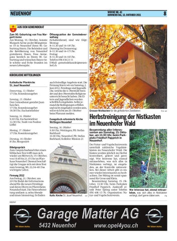 Bibelgespräch Zum Gesprächsabend über einen biblischen Text trifft man sich wieder am Mittwoch, 19. Oktober, von 19.45 bis 21.15 Uhr im Pfarrhaus Neuenhof. Diesmal beschäftigt die Gruppe sich mit dem Text zum Sonntag, Mt, 22,34–40: Das wichtigste Gebot. Firmung 2012 Am Freitag, 21. Oktober, um 20 Uhr findet der Informationsabend für die neuen Firmlinge und deren Eltern im Pfarreiheim Neuenhof statt. Die Firmvorbereitung umfasst ca. zehn Abende und einen Intensivtag. Es finden INSERAT