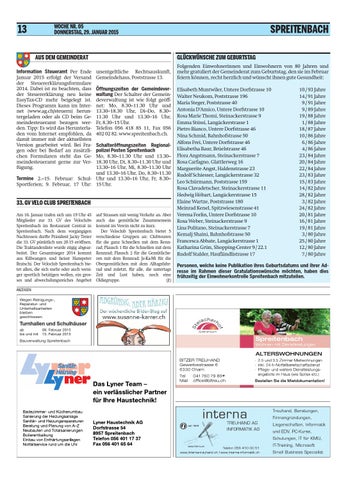 GLÜCKWÜNSCHE ZUM GEBURTSTAG unentgeltliche Rechtsauskunft, Gemeindehaus, Poststrasse 13. Öffnungszeiten der Gemeindeverwaltung Der Schalter der Gemeindeverwaltung ist wie folgt geöffnet: Mo, 8.30–11.30 Uhr und 13.30–18.30 Uhr, Di–Do, 8.30– 11.30 Uhr und 13.30–16 Uhr, Fr, 8.30–15 Uhr. Telefon 056 418 85 11, Fax 056 402 02 82. www.spreitenbach.ch.