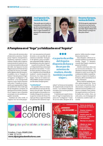 A Pamplona en el “Arga”y a Valdizarbe en el“Arguica” Lleva cerca de noventa años al lado de la carretera. Viendo pasar. Viajeros, transportistas, autobuses, camiones, coches o ciclistas. Dando calor a viajeros, entreteniendo la tarde de vecinos y favoreciendo la vida social del valle. José Ignacio Cía San Miguel nació en la Venta de Úcar en el año 26. Por eso, si en Valdizarbe alguien sabe de transporte público, ése es “Joaquín el Ventero”. Ha visto pasar el “Arga”, el “Arguica”, “La Raguesa” o “La Añorbesa” y ha transportado viajeros como taxista durante ocho años.“Cuando yo era pequeño, por aquí pasaba el ‘Arga’, un autobús de color verde que iba de Pamplona a Artajona. El que hacía el recorrido contrario era el ‘Arguica’, que se llamaba así porque era un autobús pequeño”, recuerda. También de color verde, el “Arguica” era “un coche peque-