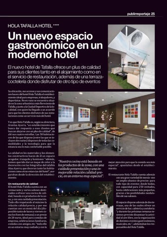 Un nuevo espacio gastronómico en un moderno hotel El nuevo hotel de Tafalla ofrece un plus de calidad para sus clientes tanto en el alojamiento como en el servicio de restauración, además de una terrazacoctelería donde disfrutar de otro tipo de eventos Su ubicación, sus accesos y sus comunicaciones hacen del hotel Hola Tafalla el establecimiento ideal para empresas, trabajadores, y deportistas. No en vano se encuentra situado en la zona urbanística más floreciente de Tafalla, y junto a la Ciudad Deportiva de la localidad, con quien ha llegado a un acuerdo para que los clientes disfruten de sus instalaciones como un servicio más del hotel. Y es que Hola Tafalla es, según su directora, Arantxa Ayarra, “un establecimiento que busca dar respuesta a esos clientes que buscan alojarse con un plus de calidad”, de ahí sus cuatro estrellas. Las 58 habitaciones de las que dispone (entre las que se incluyen dos suites) disponen de todas las comodidades y la tecnología para que la estancia sea lo más confortable posible. La calidad en los materiales y los elementos constructivos hacen de él un espacio acogedor, tranquilo y luminoso: “además, hemos querido dar un toque de color a la decoración con las fotografías del tafallés Atxu Ayerra, que decoran tanto las habitaciones como otras estancias del hotel”, aseguraban desde la dirección del establecimiento. Un restaurante de calidad