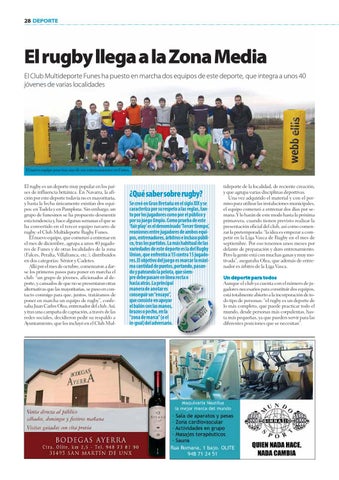 El rugby es un deporte muy popular en los países de influencia británica. En Navarra, la afición por este deporte todavía no es mayoritaria, y hasta la fecha únicamente existían dos equipos: en Tudela y en Pamplona. Sin embargo, un grupo de funesinos se ha propuesto desmentir esta tendencia y, hace algunas semanas el que se ha convertido en el tercer equipo navarro de rugby: el Club Multideporte Rugby Funes. El nuevo equipo, que comenzó a entrenar en el mes de diciembre, agrupa a unos 40 jugadores de Funes y de otras localidades de la zona (Falces, Peralta, Villafranca, etc.), distribuidos en dos categorías: Sénior y Cadetes. Allá por el mes de octubre, comenzaron a darse los primeros pasos para poner en marcha el club: “un grupo de jóvenes, aficionados al deporte, y cansados de que no se presentaran otras alternativas que las mayoritarias, se puso en contacto conmigo para que, juntos, tratáramos de poner en marcha un equipo de rugby”, confesaba Juan Carlos Olea, entrenador del club. Así, y tras una campaña de captación, a través de las redes sociales, decidieron pedir su respaldo a Ayuntamiento, que los incluyó en el Club Mul-