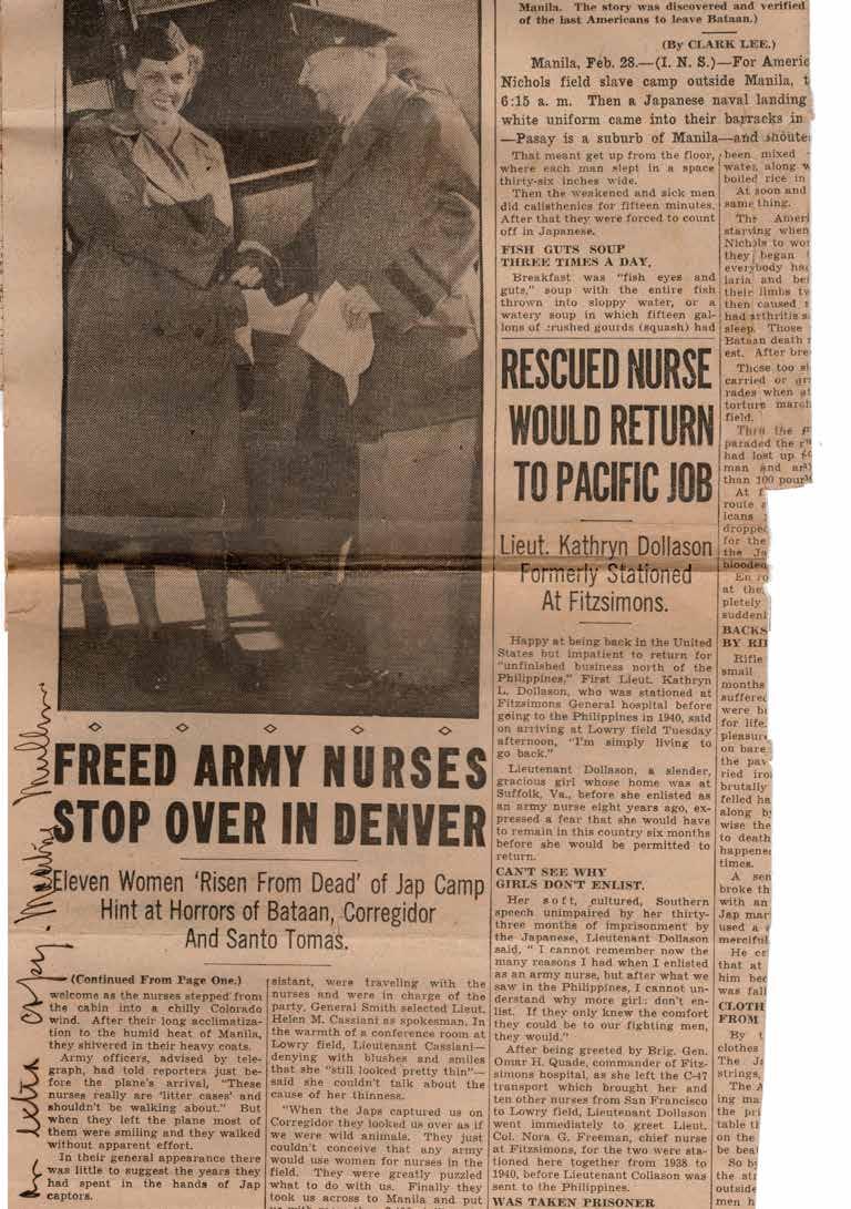 caring for the sick and wounded despite their own suffering. In September 1944, American planes began bombing Manila. As U.S. troops advanced in early 1945, fears grew that Japanese forces would massacre prisoners. On February 3, 1945, the sounds of gunfire and American tanks echoed through the compound. Kathryn Dollason and 66 other Army nurses were finally freed.