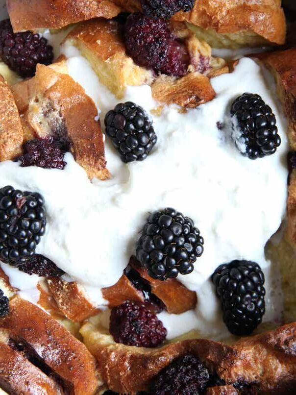 Sprinkle half of the blackberries over top the toast, transfer to the oven and bake for 45-50 minutes or until the French toast is golden and crisp.