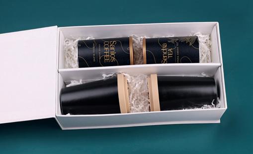 The set with Freedom mobile mugs is a combination of mobility and subtle branding. Inside, there is also selected „Santos Coffee” and „Sencha Tea” in elegant tins. The whole is packed in an exclusive, snow-white box with a magnetic closure.