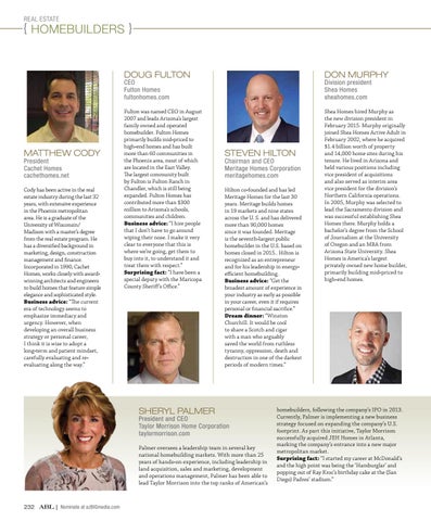 Chairman and CEO Meritage Homes Corporation meritagehomes.com Hilton co-founded and has led Meritage Homes for the last 30 years. Meritage builds homes in 19 markets and nine states across the U. S. and has delivered more than 90,000 homes since it was founded. Meritage is the seventh-largest public homebuilder in the U.S. based on homes closed in 2015.. Hilton is recognized as an entrepreneur and for his leadership in energyefficient homebuilding. Business advice: “Get the broadest amount of experience in your industry as early as possible in your career, even it if requires personal or financial sacrifice.” Dream dinner: “Winston Churchill. It would be cool to share a Scotch and cigar with a man who arguably saved the world from ruthless tyranny, oppression, death and destruction in one of the darkest periods of modern times.”