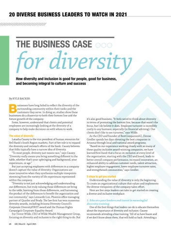 usinesses have long failed to reflect the diversity of the surrounding community within their ranks and the customers they serve. In doing so, studies show these businesses do a disservice to both their bottom line and the future growth of the company. Some, however, understand that clients and potential employees are increasingly looking at the diversity of a company to help make decisions on with whom to work. The value of diversity Latasha Causey is the vice president of human resources for Bell Bank’s South Region markets. Part of her role is to expand the diversity and outreach efforts of the bank. Causey believes that folks typically have a narrow idea of diversity. “To most people, diversity just means race,” says Causey. “Diversity really means you bring something different to the table, whether that’s your upbringing and background, your experiences, or age.” But just accepting employees with differences in a company doesn’t capture the value of diversity. Organizations are more innovative when they synthesize multiple viewpoints stemming from the variety of life experiences represented within the company. “Diversity is not just acknowledging and understanding our differences, but truly valuing those differences we bring to the table, learning from those differences, and harnessing the product of the differences to benefit the organization and our community,” says Leonardo Loo, Phoenix office managing partner of Quarles and Brady. The law firm has won numerous diversity awards, including Arizona Diversity Council’s Corporate DiversityFIRST award and the Human Rights Campaign’s Corporate Equality Award. For Trevor Wilde, CEO of Wilde Wealth Management Group, focusing on diversity and inclusion is the right thing to do. But
