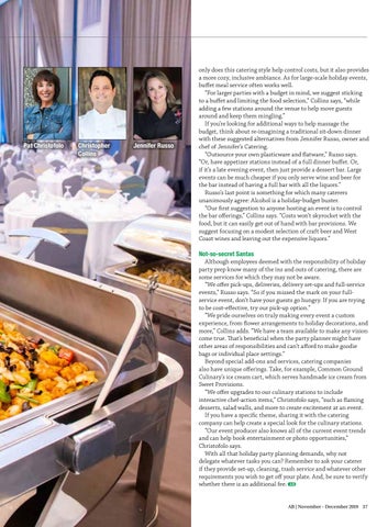 only does this catering style help control costs, but it also provides a more cozy, inclusive ambiance. As for large-scale holiday events, buffet meal service often works well. “For larger parties with a budget in mind, we suggest sticking to a buffet and limiting the food selection,” Collins says, “while adding a few stations around the venue to help move guests around and keep them mingling.” If you’re looking for additional ways to help massage the budget, think about re-imagining a traditional sit-down dinner with these suggested alternatives from Jennifer Russo, owner and chef of Jennifer’s Catering. “Outsource your own plasticware and flatware,” Russo says. “Or, have appetizer stations instead of a full dinner buffet. Or, if it’s a late evening event, then just provide a dessert bar. Large events can be much cheaper if you only serve wine and beer for the bar instead of having a full bar with all the liquors.” Russo’s last point is something for which many caterers unanimously agree: Alcohol is a holiday-budget buster. “Our first suggestion to anyone hosting an event is to control the bar offerings,” Collins says. “Costs won’t skyrocket with the food, but it can easily get out of hand with bar provisions. We suggest focusing on a modest selection of craft beer and West Coast wines and leaving out the expensive liquors.” Not-so-secret Santas Although employees deemed with the responsibility of holiday party prep know many of the ins and outs of catering, there are some services for which they may not be aware. “We offer pick-ups, deliveries, delivery set-ups and full-service events,” Russo says. “So if you missed the mark on your fullservice event, don’t have your guests go hungry. If you are trying to be cost-effective, try our pick-up option.” “We pride ourselves on truly making every event a custom experience, from flower arrangements to holiday decorations, and more,” Collins adds. “We have a team available to make any vision come true. That’s beneficial when the party planner might have other areas of responsibilities and can’t afford to make goodie bags or individual place settings.” Beyond special add-ons and services, catering companies also have unique offerings. Take, for example, Common Ground Culinary’s ice cream cart, which serves handmade ice cream from Sweet Provisions. “We offer upgrades to our culinary stations to include interactive chef-action items,” Christofolo says, “such as flaming desserts, salad walls, and more to create excitement at an event. If you have a specific theme, sharing it with the catering company can help create a special look for the culinary stations. “Our event producer also knows all of the current event trends and can help book entertainment or photo opportunities,” Christofolo says. With all that holiday party planning demands, why not delegate whatever tasks you can? Remember to ask your caterer if they provide set-up, cleaning, trash service and whatever other requirements you wish to get off your plate. And, be sure to verify whether there is an additional fee. AB | November - December 2019 37