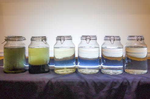 These jars of water show the stages of purification from raw reclaimed water through ultraviolet photolysis.