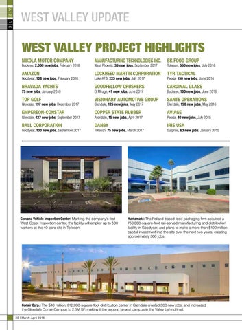 Conair Corp.: The $40 million, 812,900-square-foot distribution center in Glendale created 300 new jobs, and increased the Glendale Conair Campus to 2.3M SF, making it the second largest campus in the Valley behind Intel. 36 | March-April 2018