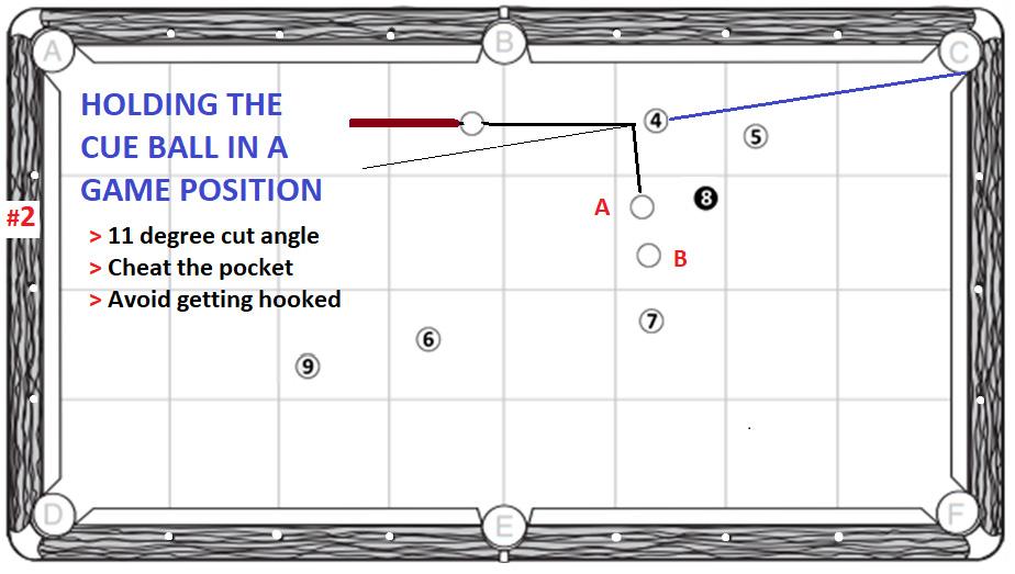 In Diagram #2 the player has an overly steep cut of 11 degrees cut on the 4-ball. There are two ways to get position: The player could try to play a stun/follow shot and use the 8-ball to