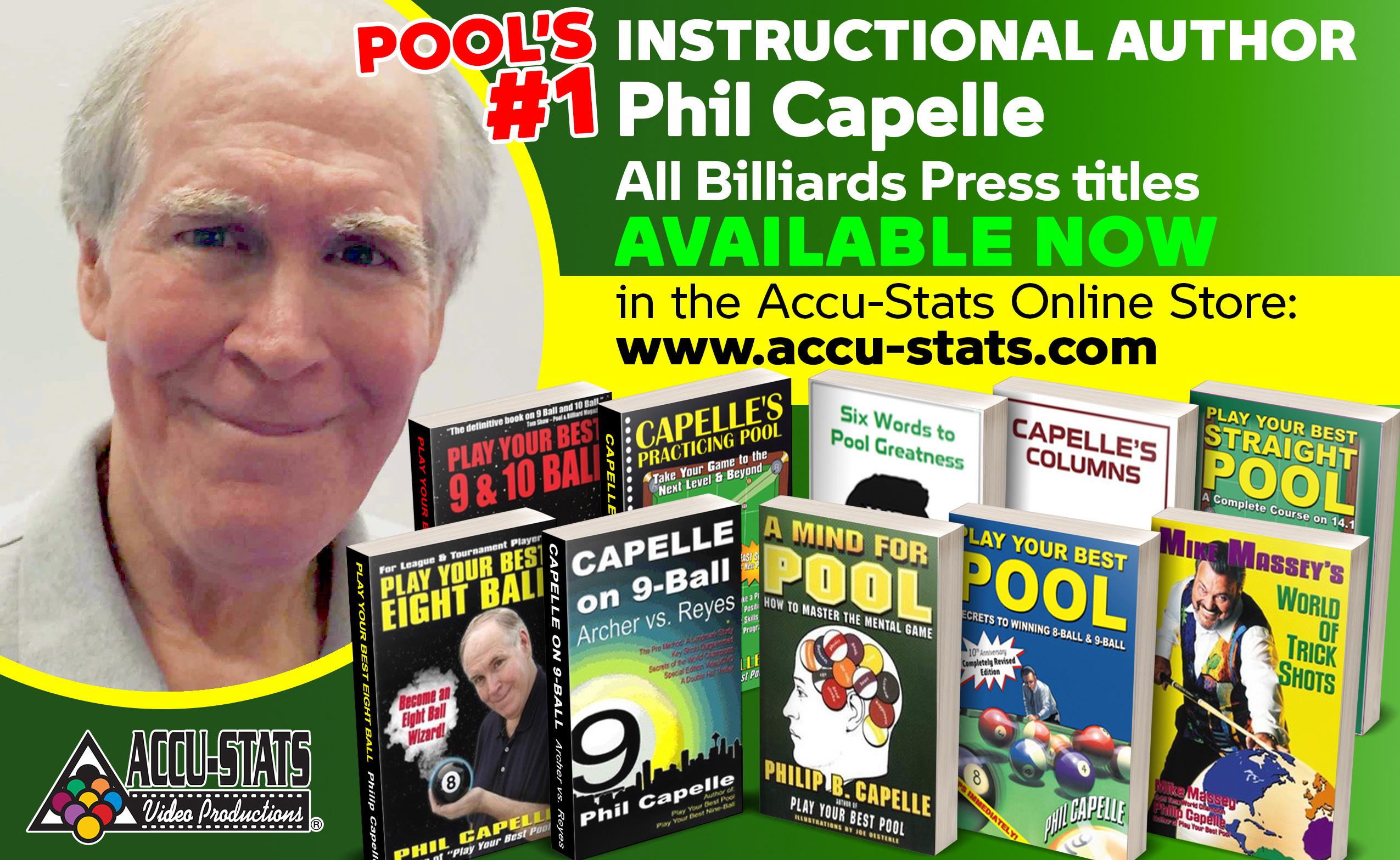 Beginning in 1968, Capelle spent 27 years competing in money games, leagues, and tournaments. In late 1994 he founded Billiards Press, and has since written 12 instructional books on pool. Over the last eight years he has conducted extensive research in preparation for his upcoming book, Pool Is The Answer. For a detailed profile of Phil Capelle, see his interview with Melinda Bailey in the April 2019 issue of the Billiards Buzz.