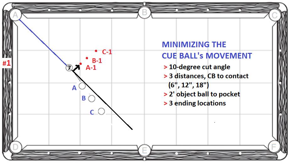 Begin by setting up a series of shots such as the ones shown in Diagram #1. Place a donut for the object ball and three more for cue ball locations A, B, and C. Then place three donuts at locations A-1, B-1, and C-1. These represent your estimates for the cue ball’s minimum traveling distance after contact. The travel distance post contact should begin to noticeably lengthen out from long distances, as shown by my guesstimates.