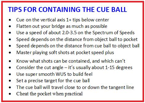 The shorter that the distance is from the cue ball to the object ball, the softer you can play the shot, which minimizes the cue ball’s travels after contact. Finally, the cut angle plays a huge role in playing successful hold shots. Basically, the shallower the cut angle, the easier it is to hold the cue ball, thus minimizing its roll after contact with the object ball.