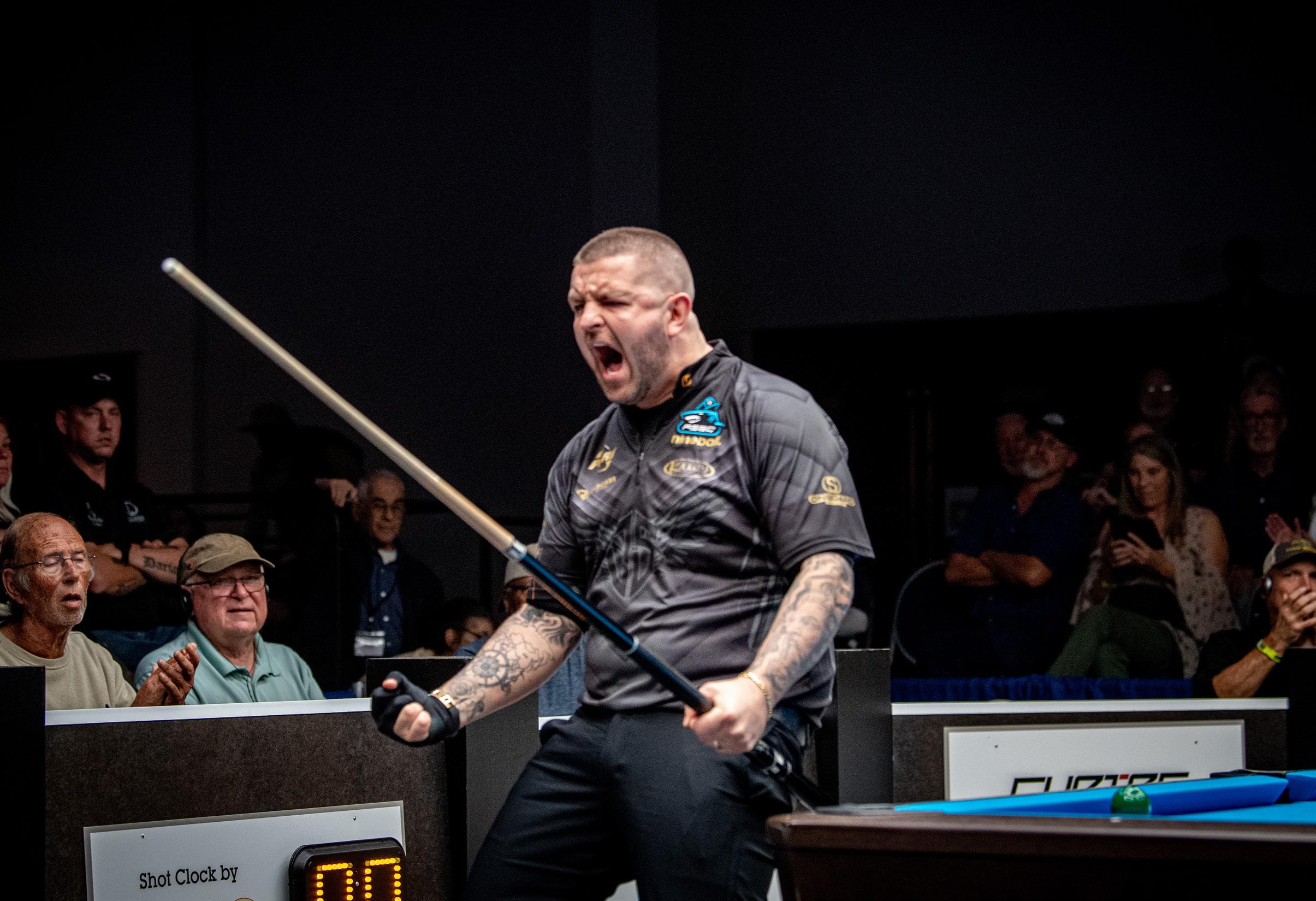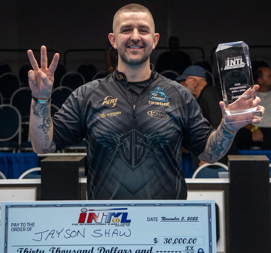Scotland’s Jayson Shaw had just won the 9-Ball tournament at Pat Flem ing’s 4th Annual International Open (his second win of the four held thus far) and he wanted everybody to know, including, it would seem, the folks working at the General Dynam ics shipyard across the bay from the