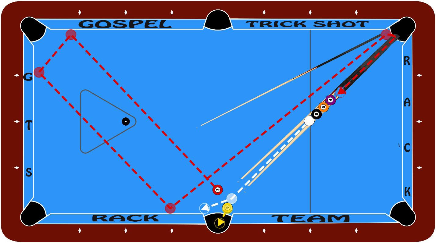 Objective: Hit the red three ball three rails around the table at just the right speed to go up the ramp opening as shown in the dia gram created by a third cue stick next to the two cue sticks that are frozen together hold ing the cue ball and the three object balls. The three ball in motion will nudge the back object ball creating all the balls to move to wards the side pocket where the cue ball hits the nine ball in the pocket with the other four balls following down into the side pocket!